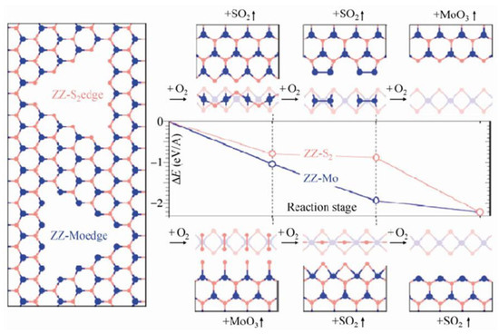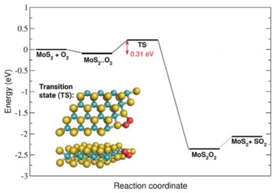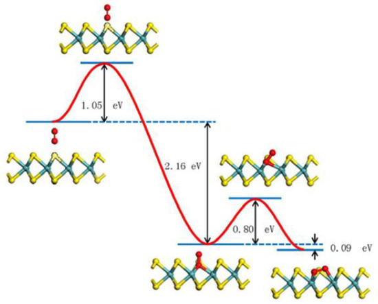 Another take on the dissociative oxygen adsorption occurring on the S-defective sites within an MoS2 basal planes has been published by Nan et al. [79], who, similarly to Santosh et al. [43], used a nudged elastic band (NEB) method implemented within their DFT calculations. They obtained an oxygen molecule substituting two neighboring Mo atoms (see Figure 16). The apparent activation energy barrier of the entire process (1.05 eV) was associated with a binding energy gain of 2.25 eV, which made the process thermodynamically favorable, similar to the results of Santosh et al., who had, however, obtained a much lower energy barrier, and thus provided a more likely reaction pathway.