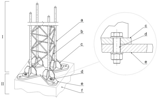 In the adopted solution a single mast consisted of a column (Figure 2 mark I) supported on a base (mark II Figure 2). The mast column was made of four main bars with a span on a square plane of a variable side from 200 mm for T00 to 450 mm for T03 (mark a Figure 2). The column was stiffened by the introduction of lattice cross-bars (mark b Figure 2). Each of the four main bars was finished with a pad (mark c Figure 2), connected with the base by screws (mark d Figure 2). The mast base consisted of a base plate (mark e Figure 2), and a foundation (mark f Figure 2), in which it was anchored. The masts of the tested product family met two basic criteria. The first assumed that they would be able to endure operating loads resulting from standard requirements for the signs and supporting structures of the road signs. The second criterion referred to easy mast decomposition as a result of the vehicle impact. In order to match these two conditions, a mechanism for the separation of the columns from its foundation was implemented in the form of screws of 5.8 class acting as a safety joint (mark d Figure 2). It allowed for the separation of the mast column (mark I Figure 2) from its base (mark II Figure 2). Due to the separation of the column from its base, it was possible to obtain a possibly low decrease of the vehicle velocity during the impact which consequently corresponded to a direct decrease of values of the injury severity metrics. The masts T00 and T03 are shown in Figure 3.