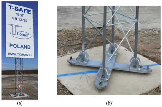 Tests were conducted for a group of supporting structures of road signs, incorporated in the product family. The product family was understood as a series of objects of the same type, various sizes, made of the same material with the use of the same design and construction method, of the same disconnection or deformation mechanisms during the vehicle impact. The tested product family consisted of four objects analyzed in relation to the requirements imposed on passively safe structures located in the direct road vicinity. Masts marked with T00, T01, T02 and T03 symbols differed mostly by the span of the main rods and their diameters. It corresponded to the ability to support road signs of various surfaces-from 2.25 m2 to 9.6 m2 (Figure 1).