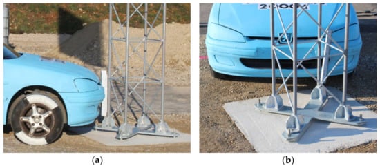 Experimental tests were performed on the La Valbonne testing track, located in the test laboratory of Transpolis SAS in Lyon, France. The tests were performed on full-size objects. Test conditions were applied following the requirements of the EN 12767 standard. The tested mast was situated centrally on the route of the moving test vehicle. It was anchored on the concrete foundation poured into stabilized soil. The top surface of the foundation was located on the road level. An angle between the mast symmetry plane and the vehicle movement route was 20° what corresponded to real operating conditions. During experimental tests, Peugeot 106 (1998) was used as a test vehicle. The static mass of the used vehicle was 905 kg. Figure 4 presents a scheme of an experiment, according to the provisions of EN 12767. Figure 5 presents the location of the vehicle in relation to the mast during the performed test experiment.