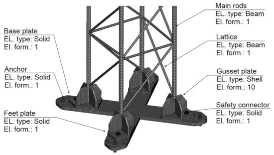 The numerical model consisted of two objects. The first was the tested supporting mast of the road sign. The numerical model of the T03 mast is graphically presented in Figure 6. Main bars and the mast lattice were modeled with BEAM elements of Hughes-Liu type of circular cross-section with numerical integration with Gaussian quadrature for four integration points. The gusset connecting the mast pad with main rods and the road sign were modeled with the application of SHELL elements of Belytschko-Tsay type with three integration points on their thickness. The base plate, mast pad slabs, anchors and screws working as safety joints were modeled with the use of constant stress SOLID elements. Connection of main bars with lattice bars and gussets was made by merging nodes of components. Gusset joining with the pad was modeled in a similar way. The contacts between mast elements and the vehicle were modeled with contact interface of AUTOMATIC_SURFACE_TO_SURFACE type. In order to model the contact between holes in the base plate and the mast pads and the screws contact elements, ERODING_NODES_TO_SURFACE were applied. This type of contact element allows for the location of new contacting surfaces which appear after the elements prone to limit strain value have been removed from the model. The connection between anchors and the foundation surface was made by taking all freedom degrees off from the nodes located at the anchor base.