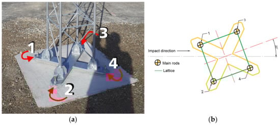 As a result of an impact, the mast column was deformed which led to the sequential breaking of the joints connecting the pads of main bars with the base plate, starting from the one closest to the impact. The order of breaking the safety joints follows the same pattern in all tested constructions. The order of breaking the bolts is depicted in Figure 8. It was possible since the main mast bars bent heterogeneously, which is shown in Figure 9a. In such a situation, the load in the safety joints is also unevenly distributed, causing the occurrence of stress concentration in the bolt most loaded at the moment. Figure 9b shows damage to the vehicle as a result of hitting the mast column.
