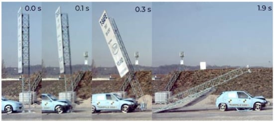 As the column was separated from the base anchored in the foundation, the mast column, as a result of an impact, rotated around the center of gravity and moved above the traveling vehicle. In the case of the test with lower velocity, the column leaned against the vehicle roof and then slid down without a complete vehicle stoppage. The results of experimental tests were presented in the form of sequential images taken by a fast camera. Figure 11 shows the result of a crash test of a vehicle with a T03 mast at 35 km/h velocities. At the moment of 0.0 s the vehicle contacted the column of the tested mast; at 0.1 s a process of destruction of joints commenced as a result of which at 0.3 s the column was completely separated from its foundation and began to rotate about its center of gravity above the vehicle. At 1.9 s the mast column fell down after the traveling test vehicle. A mechanism of separation of the mast column from its foundation for each of the tested structures was identical.