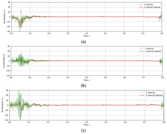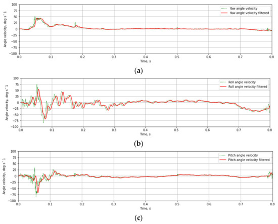 The recorded linear acceleration and angular velocity values during testing of T03 mast at 35 km/h velocities are presented in Figure 12 and Figure 13. The data collected during experimental tests were weighed with a digital low-pass Butterworth filter of fourth-order with a 3 dB cut-off frequency equal to 300 Hz (Channel Frequency Class 180) and 100 Hz (CFC 60). Figure 11 and Figure 12 present raw and weighted data.