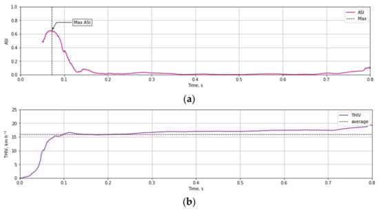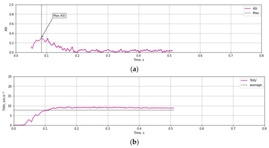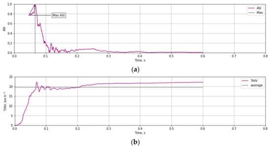 Based on the test data (Figure 12 and Figure 13) and the Equations (1)–(3) time course of ASI (Figure 14a) and THIV (Figure 14b) parameters values were calculated for the test at 35 km/h. Similarly, time courses of ASI and THIV for the test at 100 km/h (Figure 15) were determined. Methodology of calculation of ASI and THIV parameter values based on the data from the accelerometer, with the application of Python 3.0 programming language was presented in the work [42]. The proposed methodology allowed for automation of the process of determination of injury intensity parameters based on raw data directly from measuring instrumentation or being the result of numerical calculations.