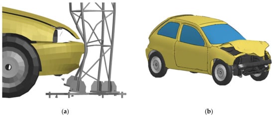 The model of a vehicle Geo Metro (Figure 7) derived from the NCAC database (George Washington University National Crash Analysis Center, Washington, DC, USA) [41] was an important element of the analysis. The vehicle used in the experimental tests weighed 905 kg. The numerical model of the vehicle initially weighed 921 kg, therefore its weight was adjusted to match exactly 905 kg. The size of the test vehicle was 1588 mm wide, 3678 mm long and 1376 mm high, respectively. The numerical model of the vehicle measured 1590 mm, 3750 mm and 1380 mm so used model corresponded to the vehicle used during experimental tests due to its size and total mass. In total, the mast T03 model contained 95,120 finite elements, 131,117 nodes, 8 material models and 13 contact interfaces between components. The calculation time for a single case was 15 h with the application of 11 calculation cores of HP820 operating station, equipped with two Intel Xeon E5-2690 v2 processors.