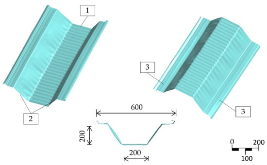 View of an ABM-240 profile fragment after rolling, dimensions in mm. 1—corrugated web, 2—corrugated flange, 3—flat lip.