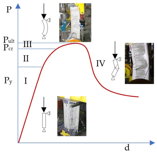 Shells’ behaviour. Buckling in the elastoplastic range. PY—yield point, Pcr—critical point, Pult—ultimate point, d—displacement. I—pre-buckling, II—pre-buckling elastoplastic range, III—post-buckling elastoplastic range, IV—failure.