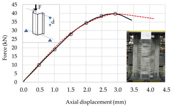 The data obtained in compression with e = 0 mm were selected for the purpose of a detailed analysis of the load displacement equilibrium path of the sample during eccentric compression. With this eccentricity, a failure mode typical of this profile occurs, consisting in compression of the corrugated part of the profile web. This sample is referred to as Model 0 in the course of this paper. The equilibrium path resulting from the eccentric compression test at e = 0 mm with the number of checkpoints is shown in Figure 6. Figure 6 also presents a simplified load diagram and the direction of displacement measurement, as well as a photograph of typical damage.