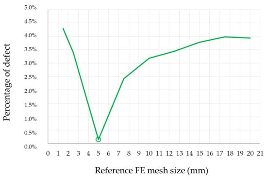 As a result, the optimal mesh with a reference dimension of 5.0 mm was adopted for further numerical tests. The numerical simulation uncertainty (determined according to Equation (1)) due to the FE mesh optimisation is USN = 0.14%.