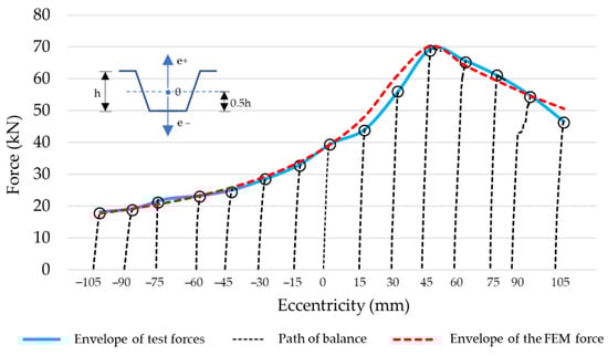 The optimised numerical model was subjected to further tests. The material model as in [36] was adopted for the calculations. The test’s purpose was to determine the error between the numerical model and the experimental test results. A series of calculations were performed to verify the maximum forces at varying eccentricity at the reference points shown in Figure 5 and Table 1, as well as the Model 0 sample equilibrium path at the reference points as in Figure 6 and Table 2. The test results are presented in Figure 8 and Figure 9. Detailed results related to the reference points are tabulated in Table 4 and Table 5, respectively.