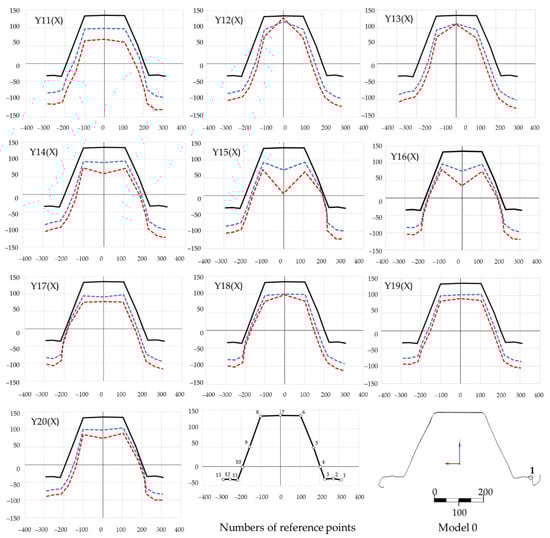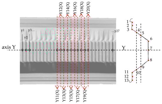 One longitudinal section, symmetrically across the profile web (Y-axis), and seven cross-sections (Y(X)-axis) were chosen. There were 27 reference points in the Y-axis; each one was 37 mm away from the next point, which corresponds to the half-wave of the web’s corrugation. The cross-sections located at reference points from Y11 (X) to Y20 (X) in the area contained three full half-waves of local deformation. In each cross-section (Y(X)-axis), there were 13 reference points according to the diagram in Figure 10. Longitudinal sections and cross-sections are placed where a representative form of deformation is expected to occur.