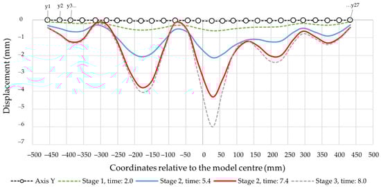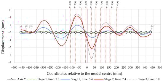 The envelopes in Figure 12 are related to the global reference frame, which means that apart from the local deformations, its components contain the global displacement component, i.e., the element axis’ deflection, which increases along with the load. Figure 13 shows the deformation lines of the numerical model in the longitudinal section at stage 2, time: 7.4. The deformation shape corresponded to the data in Figure 12. Figure 14 demonstrates the same data, however, with local deformations only. Figure 14 demonstrates the cross-sections corresponding with the designates in Figure 10. Loss of stability occurred in section Y15 (X) which was shifted by 55.5 mm in relation to the longitudinal Y-axis’ centre. The half-waves length in the measurement area (between the transverse axes) was as follows: Y14(X) − Y11(X) = 101 mm, Y17(X) − Y17(X) = 102 mm and Y17(X) − Y20(X) = 106 mm.