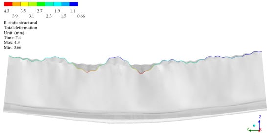 Figure 16 demonstrates the cross-sections’ deformation (Figure 15) in two loading stages: phases IIa and IIb. Plastic buckling form and develop in this load range. Plastic buckling formed and developed in the cross-section Y15(X) (Figure 16). Extremes of the local half-wave’s buckling are demonstrated in Figure 14. Figure 17 demonstrates a fragment of a deep corrugated profile section deformation. The wall surface: the flange is alternately convex and concave, similar to the web surface. Both wavy surfaces connect at the corners in such a way that the convex flange surface becomes the concave web.
