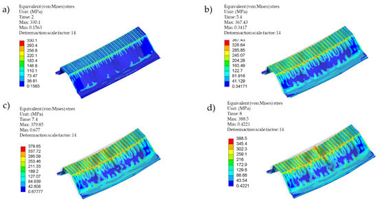 The stress maps and the test model deformation at the reference load stages, (a) stage 1: time 2.0, (b) stage 2: time 5.4, (c) stage 2: time 7.4, (d) stage 3: time 8.0.
