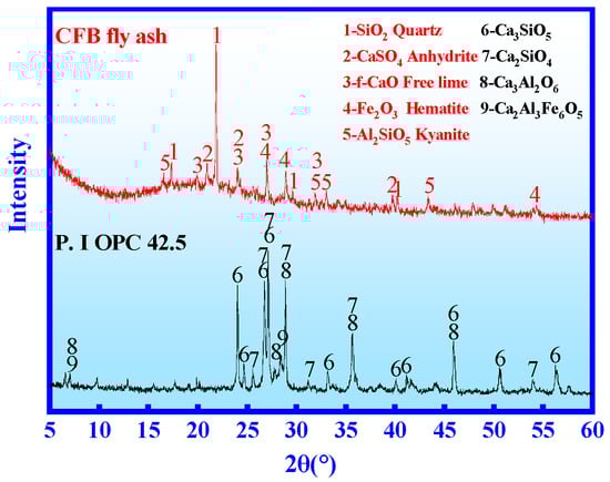 The XRD of CFB fly ash and OPC is provided in Figure 1. The main phase of CFB fly ash are SiO2, f-CaO, CaSO4, Fe2O3 and Al2SiO5. CFB fly ash contains many glassy amorphous phases. The main minerals in OPC are Ca3SiO5, Ca2SiO4, Ca3Al2O6 and Ca2Al3Fe6O5.