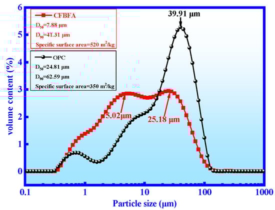 The particle size distribution is an important parameter of raw material. Figure 2 shows the particle size distributions of CFB fly ash and OPC. The particle size range of CFB fly ash is broad, mainly around 5.02 and 25.18 μm, whereas the particle size of OPC is focused on 39.91 μm. The D50 and D90 of CFB fly ash are 7.88 and 41.31 μm, which are lower than the those of OPC (24.81 and 62.59 μm. The densities of CFB fly ash and OPC are 2375.44 kg/m3 and 3062.51 kg/m3, respectively. According to GB/T 8074–2008 [26], the specific surface area of CFB fly ash and OPC is 520 m2/kg and 350 m2/kg, respectively. In additional, the specific surface area of CFB fly ash in this work is higher than that of Zhang (270 m2/kg) [1] and Zhou (121 m2/kg) [20]. The particle morphology and pore structure of the CFB fly ash are optimized. Therefore, this CFB fly ash could provide better pozzolanic activity and strength for CMM [21].
