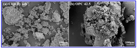 The microscopic morphology of CFB fly ash and OPC are provided in Figure 3. The shape of CFB fly ash particles is non-uniform. Meanwhile, many of the particles are aggregated, and the appearance of the particles possesses many distinct pores. However, the OPC particles is relatively loose, and small particles are exposed on the surface of OPC matrix, which is helpful to hydration reaction.