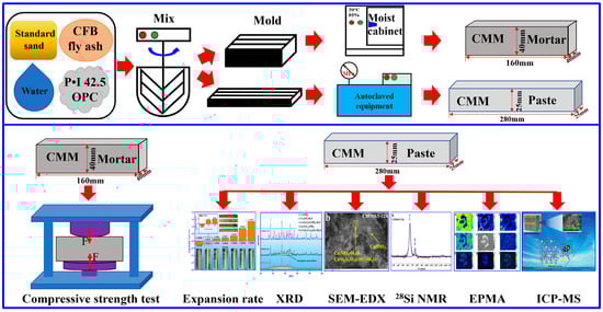 The schematic diagram of preparation and test method of CMM is rendered in Figure 4. The mass percentage of raw material in Table 2 are used to prepare mortar specimens with a dimension of 40 × 40 × 160 mm and a water/cement ratio of 0.5. Then, CMM mortars were cured for 24 h in a moist cabinet (20 ± 1 °C) with relative humidity of 95 ± 1%. In addition, the CMM mortar was removed from the mold and cured in the isothermal moist cabinet at the relative humidity of 95 ± 1% and temperature of 20 ± 1 °C until a certain time. Afterwards, the strength of CMM mortars were examined according to the Chinese standard GB/T 17671-1999 [27]. CMM paste was prepared and molded at 25 × 25 × 280 mm, and it was cured under the same curing conditions as the mortar. The autoclaved test of CMM paste was conducted according to the Chinese standard GB/T 750-1992 [28]. The autoclaved expansion rate of paste was calculated according to Equation (1), and three specimens of each CMM paste were averaged.