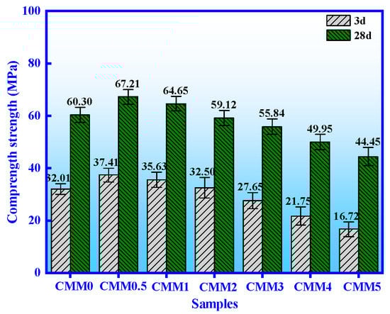 Figure 5 shows the compressive strength of CMM0~CMM5 at 3 and 28 days. The dispersion coefficient range of CMM is lower than 0.2, which indicates that these experimental values are close to the average. It is obvious that the compressive strength of CMM first increases and then decreases with the mass ratio of Ca/(Si+Al) from 2.38 to 0.83. The compressive strength of CMM is at its maximum value when the Ca/(Si+Al) was 2.13, which was 37.41 and 67.21 MPa at 3 and 28 days, respectively. Therefore, the strength value of CMM0.5 meets the 52.5 OPC strength standard in GB/T17671-1999 [27]. The reason for this phenomenon is that the CaSO4 (a mineral containing SO3) and active silica-alumina compositions in CFB fly ash are more beneficial to the generation of secondary hydration products of CMM0.5 [1]. Thereinto, the ettringite was synthesized by the early hydration reaction between CaSO4 in CFB fly ash and calcium aluminate in OPC. CMM0.5~5 contain ettringite because CFB fly ash contains SO3. The optimum strength at 3 days was presented at CMM0.5 based on the synergistic of ettringite and tricalcium silicate hydrate. Alongside this, the secondary hydration reaction of the active silica–alumina and the Ca(OH)2 produced calcium silica–aluminate gel (C-A-S-H gel) [31]. The compressive strength of CMM0.5 was increased at 28 days. Therefore, the mechanical properties of CMM0.5 are optimal, and they are composed of 5 wt.% CFB fly ash and 95 wt.% OPC.