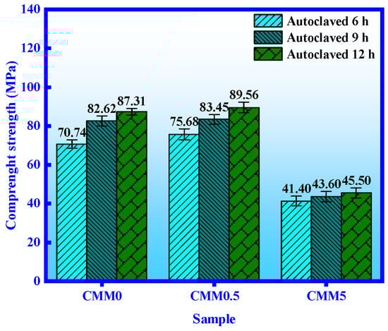 The CMM0, CMM0.5 and CMM5 were selected to investigate compressive strength of CMM mortar under autoclaved curing condition. As shown in Figure 6, the compressive strength of CMM mortar increases with the autoclaved time. The dispersion coefficients of CMM0, CMM0.5 and CMM5 are lower than 0.15 based on standard deviation calculation. This phenomenon shows that the experimental value of autoclaved strength is closer to the mean value. The compressive strength of CMM0–12 h (OPC) mortar is 87.31 MPa, which is higher than that of standard curing for 360 days (70 MPa) [32]. This result indicates that the hydration reaction rate of OPC is raised by autoclaving relative to standard curing. The compressive strength of CMM showed an inverted V-shape with the Ca/(Si+Al) mass ratio from 2.38 to 0.83, and the compressive strength of CMM0.5 was the highest. This proves that the hydration degree of CMM0.5 under autoclaved condition is higher based on the synergy of CFB fly ash and OPC. These rules are consistent with Figure 5.
