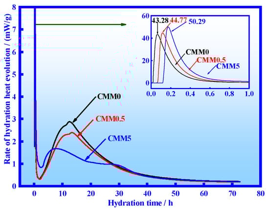 The influence of CFB fly ash on the hydration of CMM was analyzed via isothermal calorimetry. The exothermic rates of CMM0, CMM0.5 and CMM5 are shown in Figure 7, and the cumulative hydration heats are shown in Figure 8. It is apparent that the peak value of CMM0~5 exothermic rate within 1h gradually increased from 43.28 to 50.29 mW/g. The first exothermic peak is formed in a short time because calcium aluminate reacts rapidly with CaSO4 to form ettringite and release surface energy [33,34]. The second exothermic peak (main exothermic peaks) of CMM appeared at 9~14 h because of rapid hydration reaction of Ca3SiO5(C3S) in a cement clinker [33]. The main exothermic rate of CMM0, 0.5 and 5 decreased gradually with the reduction of cement clinker content in CMM. The third exothermic peak of CMM5 appears at 30 h, which is supposed to be caused by the reaction of CFB fly ash and Ca(OH)2 to form C-A-S-H gels.