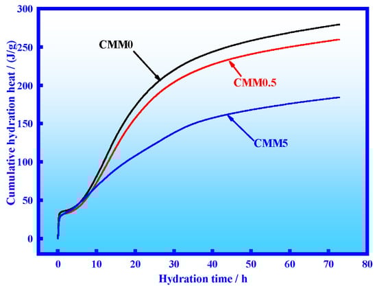 From the data in Figure 8, it is apparent that the cumulative hydration heat of CMM gradually decreased with the increase of CFB fly ash content at the same time. The cumulative hydration heat values of CMM0.5 and CMM5 at 72 h were 259.85 and 184.31 J/g, which decreased by 6.96% and 36.55% compared with CMM0, respectively. This result illustrates that the cumulative hydration heat of CMM is reduced by adding CFB fly ash.