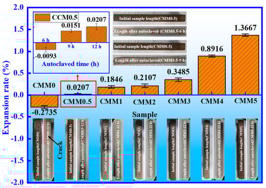 Among them, the expansion rate of CMM0-12 h is −0.2735% (the crack is circled in red in Figure 9) because of thermal expansion and cold contraction of cement hydration. This result is consistent with the results of Shi [35]. The expansion rates of CMM4–12 h and CMM5-12 h are 0.8916% and 1.3667%, respectively, which are higher than the standard value (0.5%) of GB/T 750-1992. However, the expansion rate of the CMM0.5–12 h is the lowest (0.0207%). This phenomenon proves that the long-term volume stability of CMM0.5 is optimal compared to the others. In Figure 9, autoclaved experiments of CMM0.5 were conducted at 6, 9 and 12 h to explore the rule of CMM0.5 expansion rate. It is apparent that the expansion rate of CMM0.5 increases from −0.0093 to 0.0207% with the autoclave time. This phenomenon proves that the higher strength (Figure 5) contributes to the long-time volume stability of CMM0.5.
