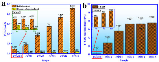 The initial content of f-CaO in CMM0.5 was 0.229%, while the content decreased from 0.096% to 0.027% after autoclave from 6 h to 12 h. As shown in Figure 10b, the reaction degree of f-CaO in CMM0.5 at 6, 9 and 12 h of autoclave was 58.52%, 78.60% and 88.21%, respectively. This result proves that the hydration reaction of f-CaO in CMM0.5 contributes to the formation of Ca(OH)2 with the autoclaved time. This also explains that the expansion rate of CMM0.5 gradually increases with the autoclaved time.