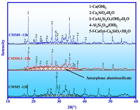 Autoclaved tests were conducted on CMM0.5 at 6, 9 and 12 h, and the mechanism of compensate for shrinkage in CMM0.5 with autoclaved time was investigated. It is apparent from Figure 12 that the diffraction peak intensity of Ca(OH)2 decreases gradually with the autoclaved time. Combined with the analysis in Figure 9, Figure 10, Figure 11 and Figure 12, it is obvious that the proportion of the Ca(OH)2 produced from the reaction of f-CaO gradually increases. This is why the expansion rate of CMM0.5 increases gradually with the autoclaved time. In addition, the diffraction peak strength of C-A-S-H gel and amorphous aluminosilicate increased gradually with the autoclaved time. Therefore, the expansion rate and compressive strength of CMM0.5 gradually increased with the autoclaved time.