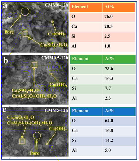 Three representative samples CMM0, CMM0.5 and CMM5 were selected to reveal the compensating shrinkage mechanism via microstructure analysis. The microscopic morphology and mineral distribution of CMM0–12 h, CMM0.5–12 h and CMM5–12 h are provided in Figure 13. It is apparent from Figure 13a that the overall microstructure of CMM0–12 h is loose and porous. Many flocculent structures are C-S-H gels, and the plate-like structure of Ca(OH)2 is exposed around C-S-H gel matrix [38]. It can be explained that the volume shrinkage of cement in the late hydration leads to its microstructure defects. In Figure 13b, CMM0.5–12 h showed a uniform microstructure compared with CMM0–12 h. In the meantime, many C-S-H, C-A-S-H gel and plate-like Ca(OH)2 agglomerated together with a densification structure. The reason for the morphology is that the secondary reaction of active silicon aluminum in CFB fly ash with Ca(OH)2 produces many C-A-S-H gel products. Ca(OH)2 was produced by reaction of f-CaO with water, causing volume expansion to compensate for volume shrinkage of OPC. Therefore, the compressive strength and volume stability of CMM0.5 is optimal. It is apparent in Figure 13c that the main microstructure of CMM5 is composed by the plate-like Ca(OH)2 with some small unreacted particles. This phenomenon proved that the flocculated structures of C-S-H and C-A-S-H gel are destroyed. Many pores were appeared due to the volume over-expansion of f-CaO. Therefore, these results of SEM-EDX are consistent with those in Figure 11 (XRD).