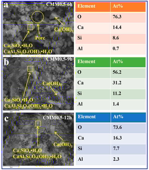 The mechanism of compensate for shrinkage of CMM0.5 were discussed with the autoclaved time. The micrographs and local element distribution of CMM0.5 autoclaved for 6, 9 and 12 h are shown in Figure 14a–c. The proportion of C-S-H and C-A-S-H gel in CMM0.5 gradually increased, while the pores gradually decreased with the autoclavic time. Therefore, CMM0.5–12 h exhibits a compact microstructure. This phenomenon indicates that the formation of C-S-H and C-A-S-H gels in CMM0.5 was promoted with the extension of autoclaved time. Meanwhile, the particle size of the plate-like Ca(OH)2 gradually increased with the autoclave time. The Ca(OH)2 in CMM0.5 was uniformly cohesive with the flocculating gel product when the autoclaved time was 12 h. According to the analysis of Figure 10 and Figure 14, the hydration reaction of f-CaO was promoted with the extension of autoclaved time. Thus, the compressive strength and volume stability of CMM0.5 gradually increase with autoclaved time. Therefore, these SEM-EDX results correspond to the XRD results in Figure 12.