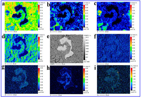 As shown in Figure 17f,h, the average content of As is 0.10 wt.%, and it is evenly distributed in the CMM0.5. Meanwhile, average content of Cr is 0.18 wt.%, which is mainly distributed in the non-enriched area of Ca, Al, Si and O. This was consistent with the results of Liu [44]; that is, Cr was absorbed by C-S-H gel. Si is replaced by As in the C-S-H gel, or As is adsorbed by C-S-H gel to generate hydration products containing As element. As shown in Figure 17i, the average content of Cu is 0.14 wt.%. Some Cu elements are concentrated in Ca, Al, Si and O regions. As shown in Figure 17g, the average content of Zn is 0.45 wt.%, and its distribution was similar to that of Cu. These phenomena indicates that Cu and Zn are probably adsorbed by C-S-H gel or participates in new chemical reactions to form minerals [45].