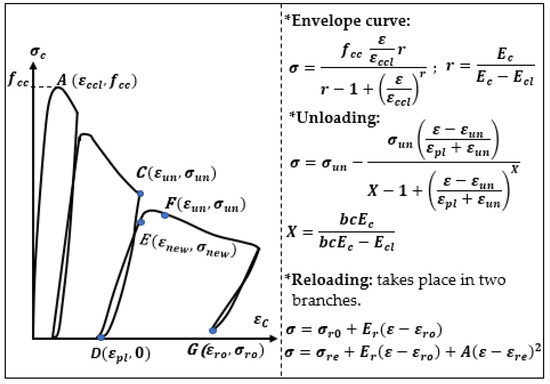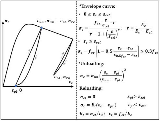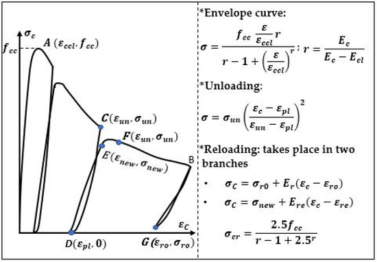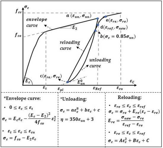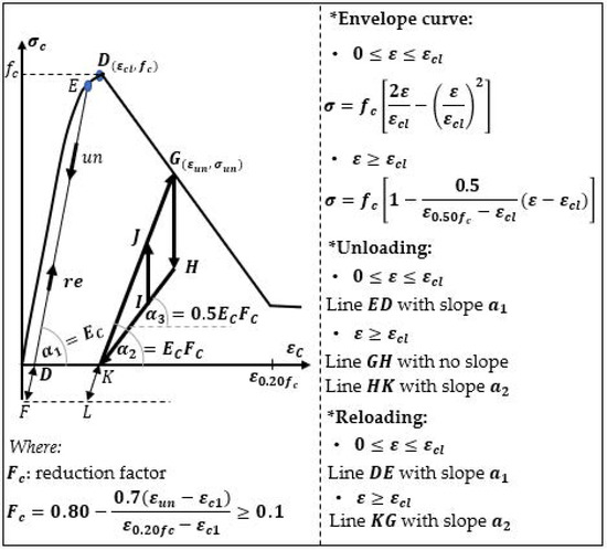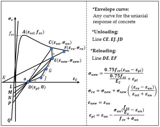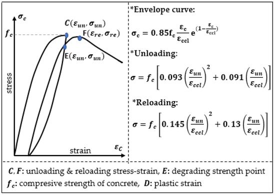 A piecewise linear model of the relation σ−ε during cyclic loading and unloading was described by Yankelevsky and Reinhard [30]. The stiffness reduction and yield limit were taken into consideration for the loading–unloading cycles with a piecewise linear slope angle (Figure 4).
