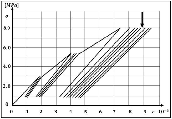 In the investigations presented above [3,12,25,29,30,31,32,33,34,35], the authors describe the loading curves and, particularly, the unloading curves with the use of parabolic or exponential functions. These functions properly describe the stress–strain relation for the specific investigations; however, the coefficients in these functions depend on the velocity of strain increments. The slower the loading–unloading cycles are, then the more similar to a straight line the curves describing these cycles become. An increment of rheological strains evoked by creep is also a straight line. Due to this, for cyclic loads in a small range, as well as for a description of creep, the double-linear model proposed by Borcz (Figure 9) appears to be justified.