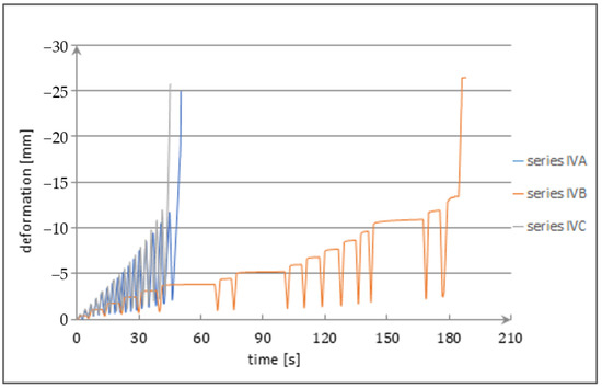 The strains and deflections were registered on the induction and resistance sensors. The loads were applied in a continuous and interrupted way. The loading cycle during the investigations is presented in Figure 12.