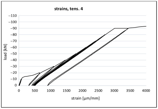 Figure 13 and Figure 14 present an example relation between the load and strain in a reinforcing bar. In the initial phase of loading it was observed that a linear relation between load and strain. It proves a good bond between steel and concrete in this phase. In the case of the beams being tested, the first cracks were observed for the loads from the range from 15–20 kN. The strain values registered in the sensors at the reinforcing bars were concordant to the concrete strains. As the load increased, a disturbance of the bond between the concrete and reinforcement was observed. As a result of this disturbance, the increase in strains accelerated. The independent investigations of the reinforcing bars allowed for the conclusion that the increase in strains did not result from a yield in steel but only from a reduction in the equivalent stiffness of the steel and the concrete cross-section area. This phenomenon could also be interpreted as the beginning of the crack formation in the concrete in the tension zone. The further forcing of the strains evoked the subsequent cracks and further increased the strains until the beam was damaged in the cross section.