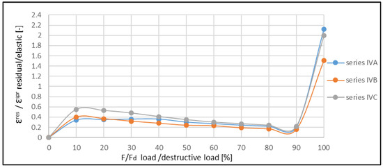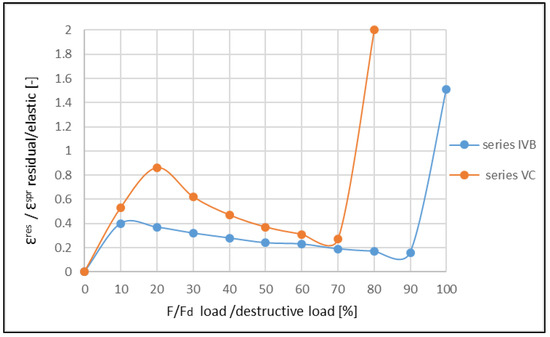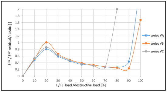 Example graph showing the ratio between residual and elastic strains regarding the ratio between the applied load and destructive load for the beams of V-th series.
