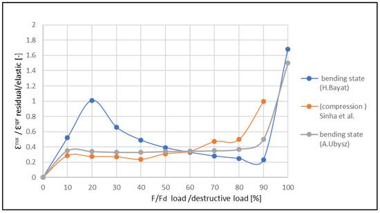 The differences in the character of the functions showing the ratios εres/εE for various levels of material effort are clearly visible in Figure 17. For concretes of lower classes, similar characteristics of the function for compressed (cf. [1]) and bent (cf. [20,22]) elements are observed. The clearly descending trend of the graph after the crack formation illustrates the small plastic deformations in the concrete structure in this phase.