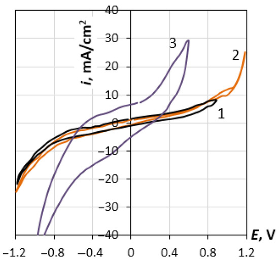 The electrochemical investigations were carried out using a potentiostat-galvanostat Parstat 2273 (Princeton Applied Research, Oak Ridge, TN, USA) at the frequency of an alternating signal of 10 kHz. Before each experiment, the dependence of the polarization current on the applied potential was analyzed to determine the electrochemical cleaning of the electrode surface and the potential interval free of any discharge-ionization processes. All experiments were performed in an argon atmosphere.