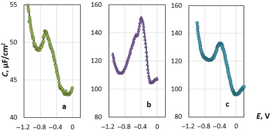 In the vicinity of the C-E curve minimum, the capacitance increases as the electrode potential shifts both in the negative direction and (up to a certain point) towards positive values, which is fully consistent with the GCS theory [38]. It is significant that on the anode branch of the C-E curve, the capacitance increases as the potential shifts towards positive values, forming a clear “dome” at Ec. At more positive potentials, the capacitance decreases sharply and reaches a minimum value, after which it begins to grow again. The experimental curves resemble those obtained for platinum and gold electrodes in the alkali halide melts [19,20,21,24,25,38]. Such an anomaly was not observed on the silver and copper electrodes [25,26].