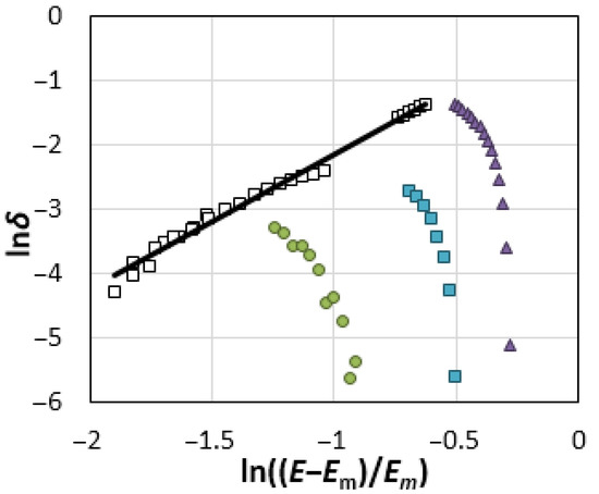 The dependences of the deformation coefficient of DEL δ = ∆L/LEm on the reduced potential (E − Em)/Em in the logarithmic form for the Re electrode in NaCl (●), KCl (▲) and CsCl (■) melts (with potentials more positive than the Ec) and in the range of potentials from Em to Ec (□) at 1093 K.