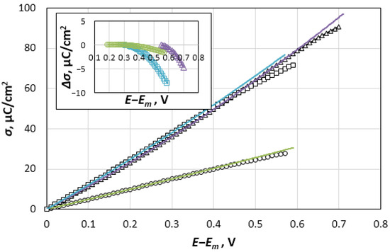 To substantiate this hypothesis, we present an analysis of the change in the charge density, σ, of the electrode for the anode branch of the curve as a function of the potential. In Figure 5, the charge values detected by integrating the experimental capacitance curves of the studied systems at 1093 K are plotted relative to E − Em. According to the GCS theory, this dependence should satisfy the exponential equation: