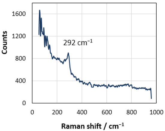 Unfortunately, the technical problems of setting up such experiments at high temperature have not been overcome yet, mainly due to the lack of suitable construction materials and equipment. Nevertheless, we tried to determine the form of the existence of the chlorine anion on rhenium by the ex situ spectroscopic studies of the electrode after anodic polarization at room temperature. Figure 6 shows the Raman spectrum of the studied electrode surface after anodic polarization in the potassium chloride melt. The Raman-active mode detected at 292 cm−1 is explained by the Re–Cl stretching vibration [52]. According to the theory of hybridization of atomic orbitals, the presence of Cl− ligands should promote the mixing of s-, p-, and d-orbitals of rhenium, leading to the formation of four hybrid dsp2 orbitals [53]. As a result, it can be expected that [ReCl4]− complex anions, having the form of a flat square or [Re2Cl8]2− clusters [54,55], are formed on the electrode. At a certain anode current density and temperature, these complex anions can acquire the form of RReCl4 salts (here, R is an alkali cation), which leads to the passivation of the electrode. Thus, the Ec potential may be considered a critical point of transition from an electrostatic adsorption to a chemical one.