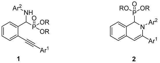 Only a few papers have been reported on the synthesis of α-amino (2-alkynylphenyl)-methylphosphonates (1) and 1,2-dihydroisoquinolin-1-ylphosphonates (2) (Figure 1) by the three-component condensation of 2-alkynylbenzaldehydes, primary amines, and dialkyl phosphites.