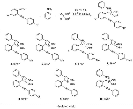 In the next round, the T3P®-promoted Kabachnik–Fields reaction was carried out starting from various 2-alkynylbenzaldehydes, aniline, and dialkyl phosphites under the optimized conditions (1 equiv of T3P®, 25 °C, 1 h) (Figure 2). The dibutyl ((phenylamino)(2-(p-tolylethynyl)phenyl)methyl)phosphonate (3) was isolated from the experiment marked by Table 1, Entry 4 in a yield of 96% after the extraction. Performing the condensation of (2-(p-tolylethynyl)benzaldehyde with aniline and dibenzyl phosphite, compound 5 was synthesized in a yield of 93%. The three-component reaction of aniline and dibutyl phosphite was also carried out with 4-fluoro-2-(p-tolylethynyl)-, 2-((4-methoxyphenyl)ethynyl)-, and 2-((4-chlorophenyl)ethynyl)benzaldehyde, as well as with 2-(phenylethynyl)benzaldehyde, and the corresponding α-aminophosphonates (6–9) were obtained in yields of 87–98%. The reactions of 2-alkynylbenzaldehydes containing an electron donating group, such as methyl or methoxy group, on the phenyl ring, resulted in slightly lower yields (87% or 89%, respectively). In contrast, α-amino (2-alkynylphenyl)-methylphosphonates bearing a 4-chloro substituent on the phenyl ring (9) or the unsubstituted derivatives (10) were isolated in excellent yields. Finally, the condensation of 2-(phenylethynyl)benzaldehyde and aniline was carried out with diethyl phosphite, and the result obtained was similar to that of the reaction performed with dibutyl phosphite.