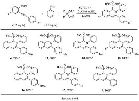 In the next series of experiments, the CuCl-catalyzed special Kabachnik–Fields reaction of 2-alkynylbenzaldehydes, aniline, and dialkyl phosphites was extended using the optimized conditions (5 mol% CuCl, MeCN, 60 °C, 1 h) (Figure 3). The dibutyl (2-phenyl-3-(p-tolyl)-1,2-dihydroisoquinolin-1-yl)phosphonate (4) was isolated from the experiment marked by Table 1, Entry 14 in a yield of 79% after column chromatography. The condensation of (2-(p-tolylethynyl)benzaldehyde and aniline was also carried out with dimethyl or diethyl phosphite as the P-reagent, and the (2-phenyl-3-(p-tolyl)-1,2-dihydroisoquinolin-1-yl)phosphonates (11 and 12) were obtained in yields of 86% and 83%, respectively. Performing the three-component reaction of aniline and dibutyl phosphite with 4-fluoro-2-(p-tolylethynyl)-, 2-((4-methoxyphenyl)ethynyl)-, and 2-((4-chlorophenyl)ethynyl)benzaldehyde, as well as with 2-(phenylethynyl)benzaldehyde, the corresponding dialkyl (2-phenyl-3-aryl-1,2-dihydroisoquinolin-1-yl)phosphonates (13–16) were isolated in yields of 80–82% after column chromatography.
