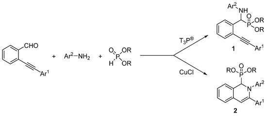 In this paper, we describe simple and selective preparation methods for the synthesis of new α-amino (2-alkynylphenyl)-methylphosphonates (1), as well as novel 1,2-dihydroisoquinolin-1-ylphosphonates (2) by the three-component reaction of 2-alkynylbenzaldehydes, aromatic amines, and dialkyl phosphites using different catalytic systems (T3P® or CuCl) (Scheme 1). There is no example in the literature of the use of T3P® in the three-component reaction mentioned.
