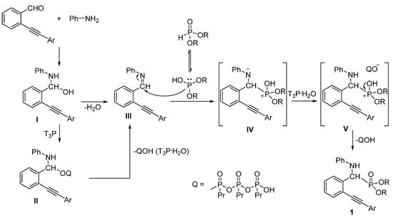 The formation of α-amino (2-alkynylphenyl)-methylphosphonates by the T3P®-promoted Kabachnik–Fields reaction can be explained by the proposed mechanism shown in Scheme 2. First, by the reaction of 2-alkynylbenzaldehyde and aniline, imine III is formed via adduct I. This condensation may be promoted by T3P® to afford imine III along with tripropyl triphosphonic acid (QOH) as the by-product. The dehydration may take place via adduct II. In the next step, imine III reacts with the dialkyl phosphite in a nucleophilic addition, and after a protonation by T3P.H2O, the phosphonium salt V formed is stabilized by an Arbuzov fission to furnish α-amino (2-alkynylphenyl)-methylphosphonates (1) and the T3P.H2O by-product.