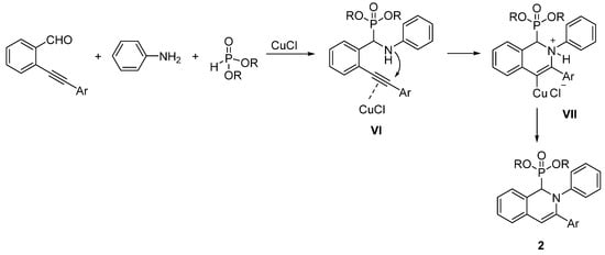 The formation of 1,2-dihydroisoquinolin-1-ylphosphonates (2) by the CuCl-catalyzed three-component reaction can be explained by the mechanism shown in Scheme 3. First, by the Kabachnik–Fields reaction of 2-alkynylbenzaldehyde, aniline, and dialkyl phosphite, α-aminophosphonate VI is formed. Then, the CuCl catalyst activates the triple bond for the intramolecular nucleophile attack of the amino group. This ring closure step results in an organocopper cyclic ammonium salt VII, which is stabilized by a deprotonation/protonation step (parallelly losing the CuCl unit) to form the 1,2-dihydroisoquinolin-1-ylphosphonate (2).